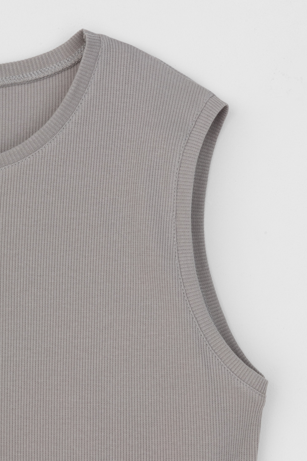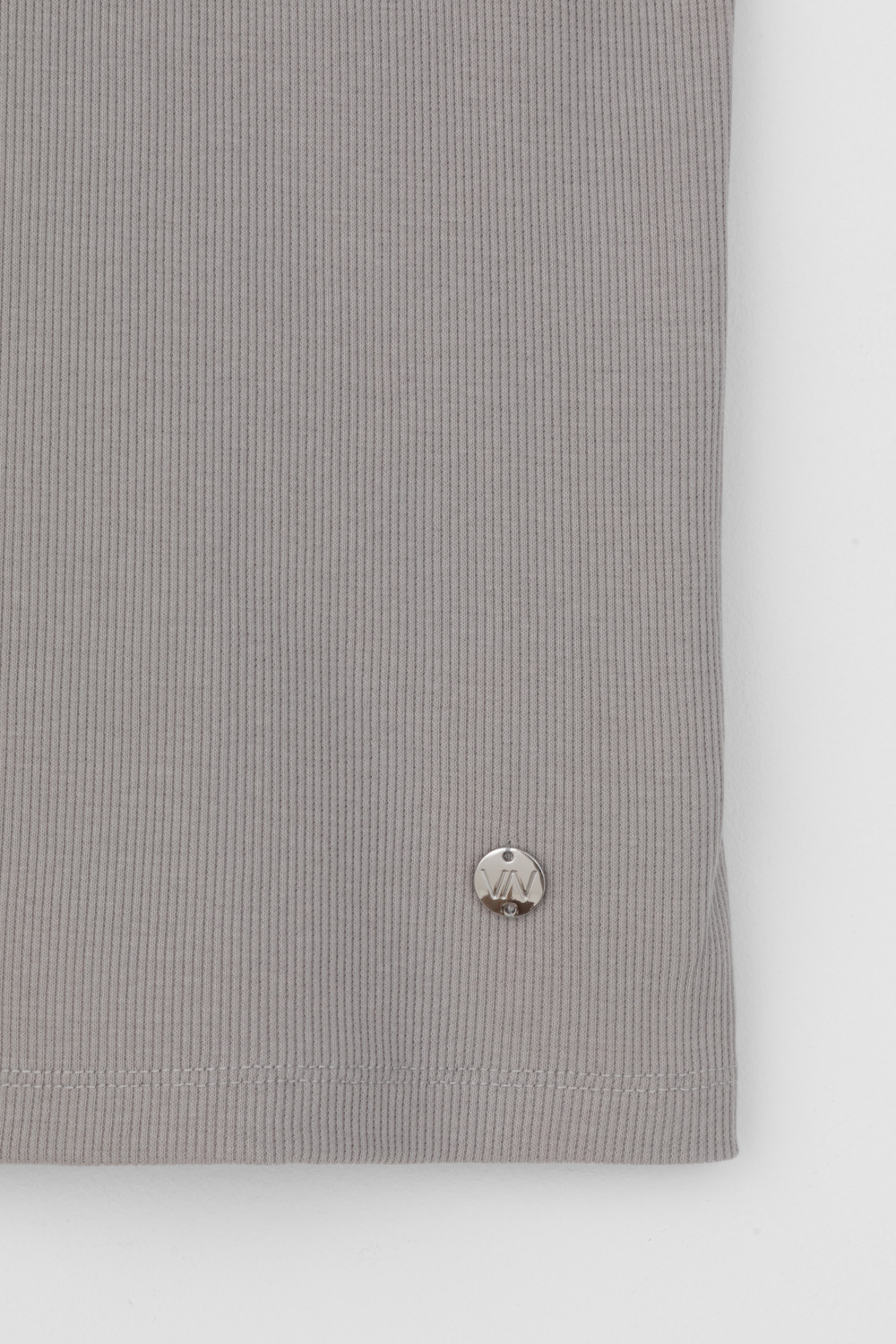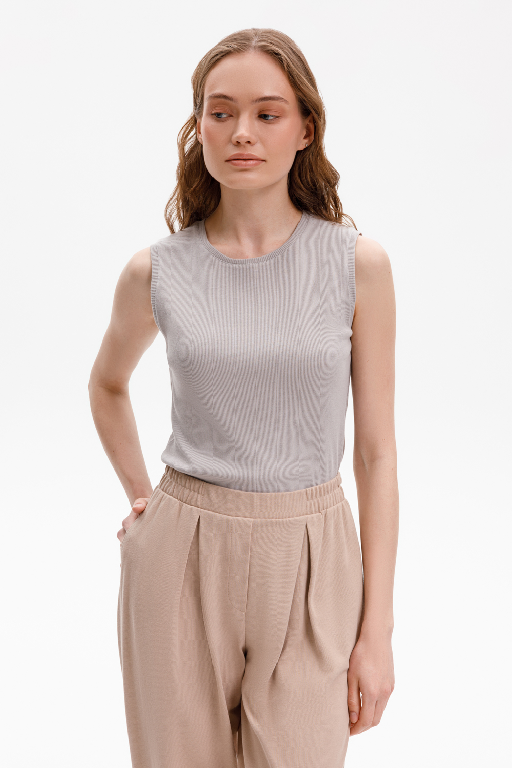 Базовым элементом гардероба является топ из эластичного трикотажа в рубчик. Широкое плечо и высокий вырез делают изделие комфортным и универсальным в носке.