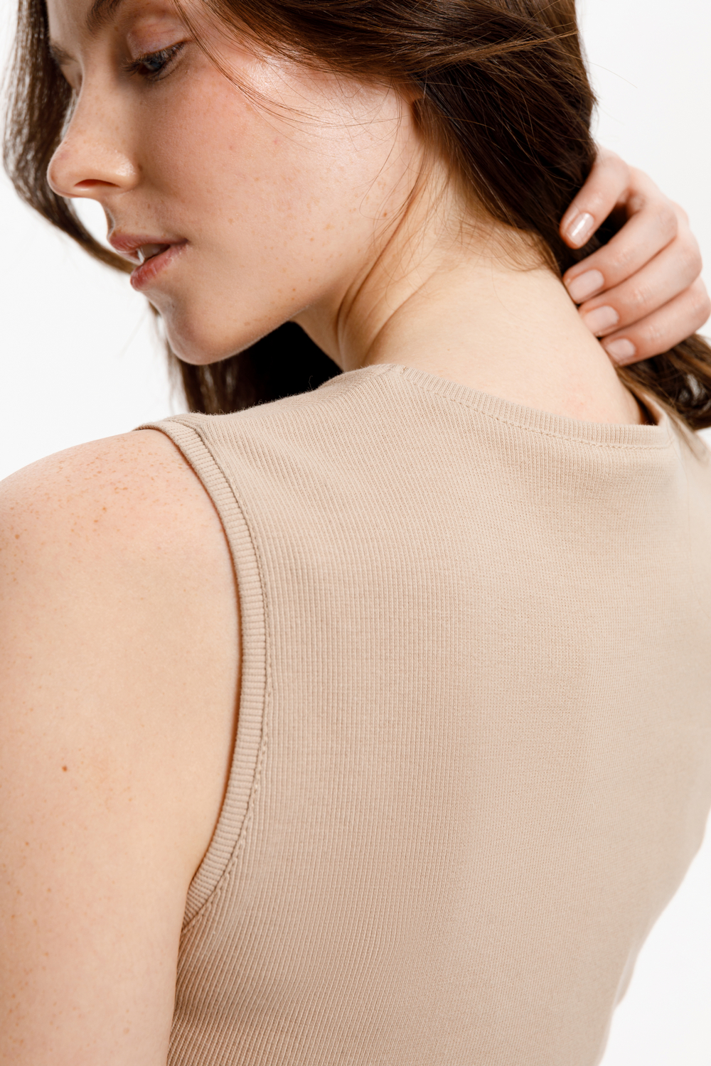 Базовым элементом гардероба является топ из эластичного трикотажа в рубчик. Широкое плечо и высокий вырез делают изделие комфортным и универсальным в носке.