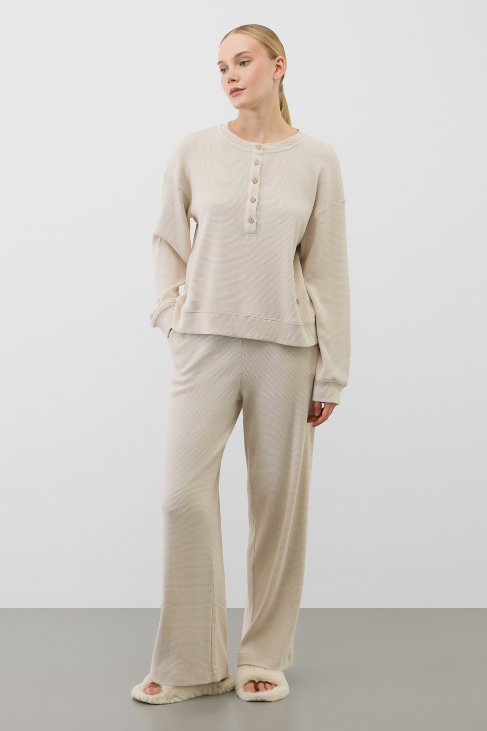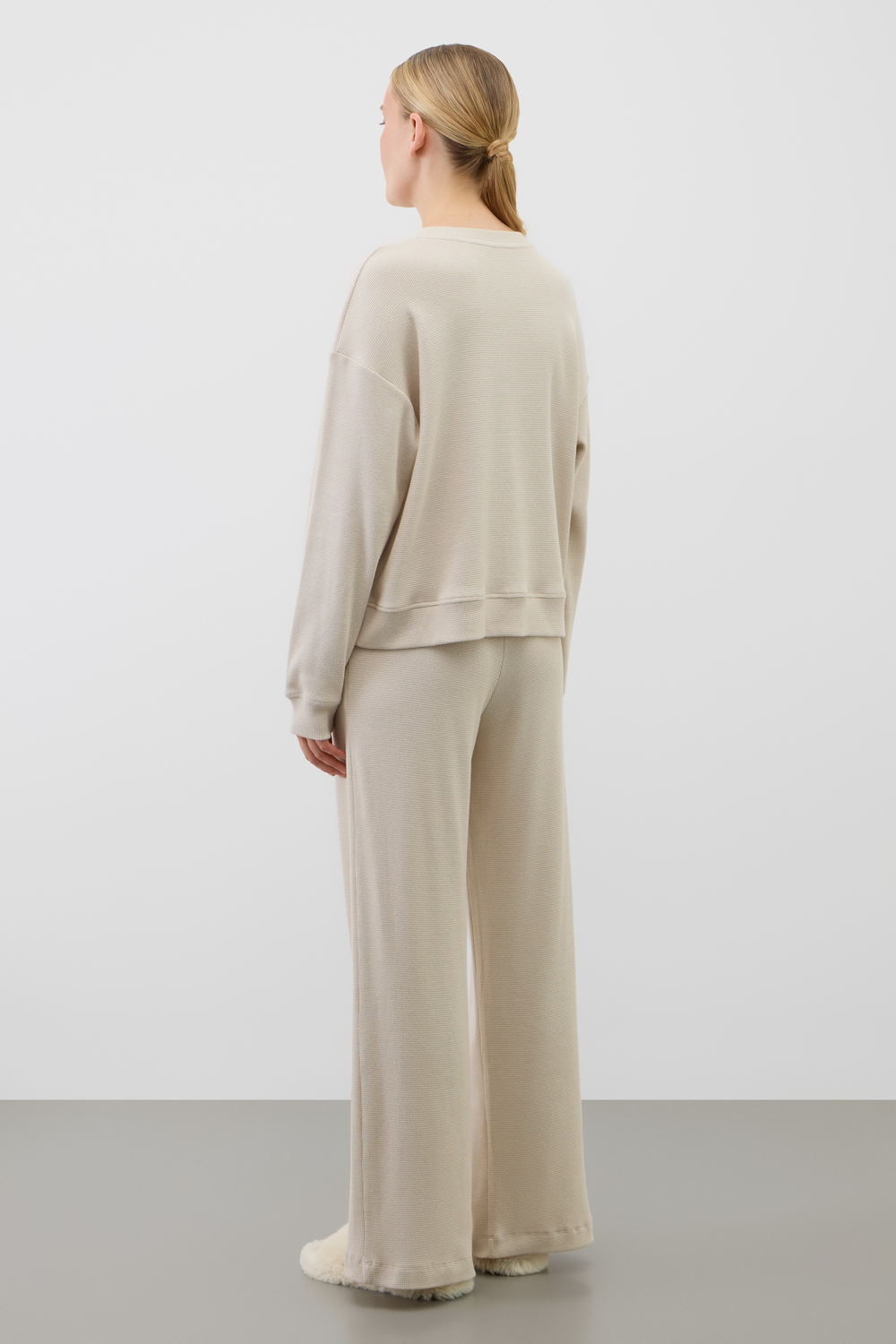 Комплект из объемного трикотажа с добавлением эластичных волокон. Свободный крой обеспечивает легкость и свободу движений.