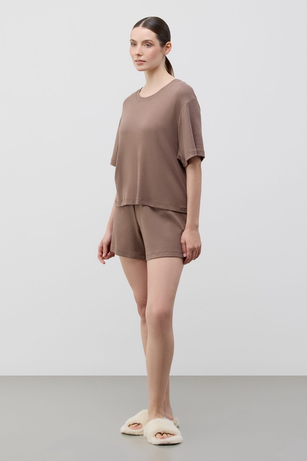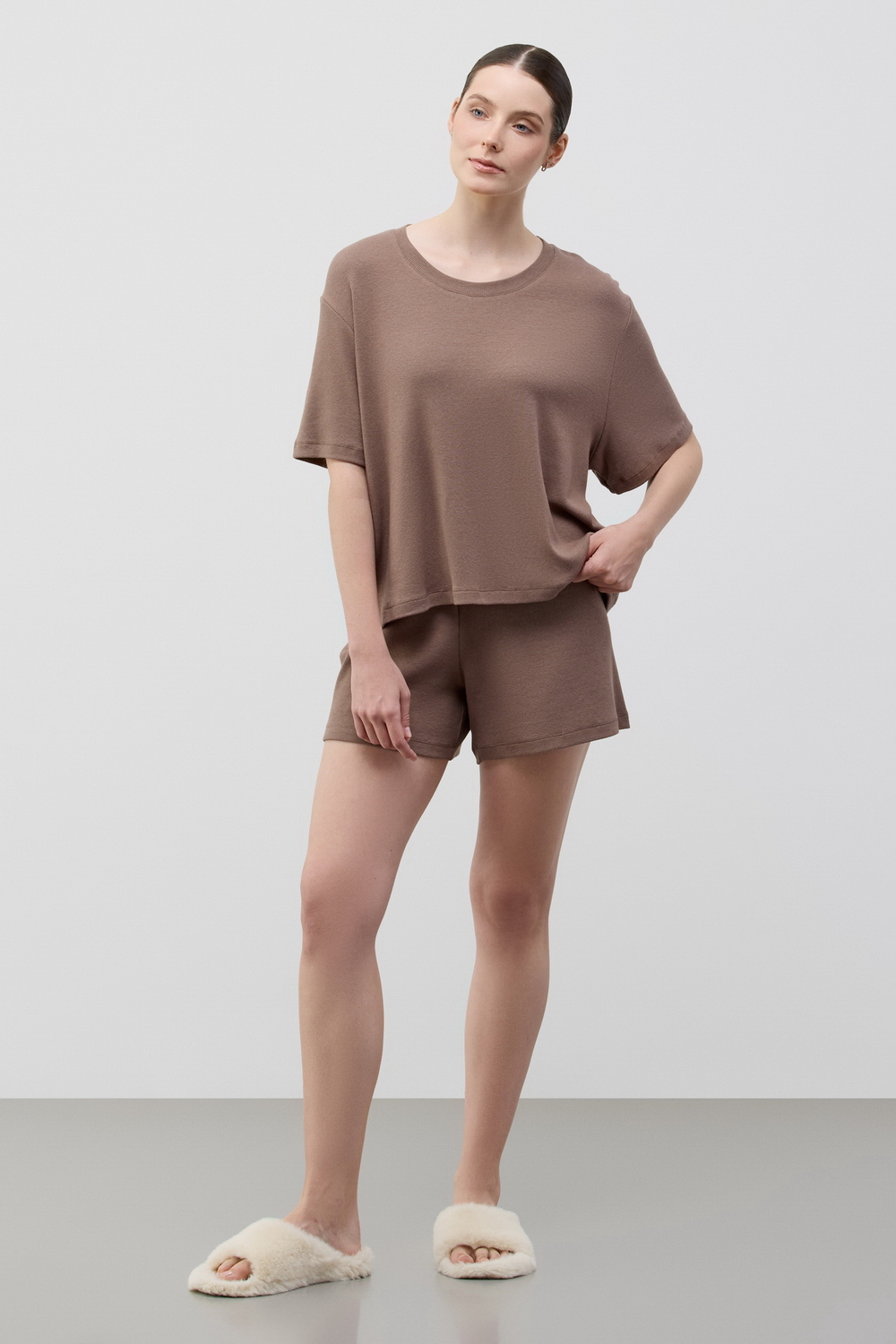 Комплект из нежного хлопкового трикотажа в рубчик с добавлением вискозы. Мягкий и эластичный на ощупь трикотаж обеспечивает легкость и приятное облегание.