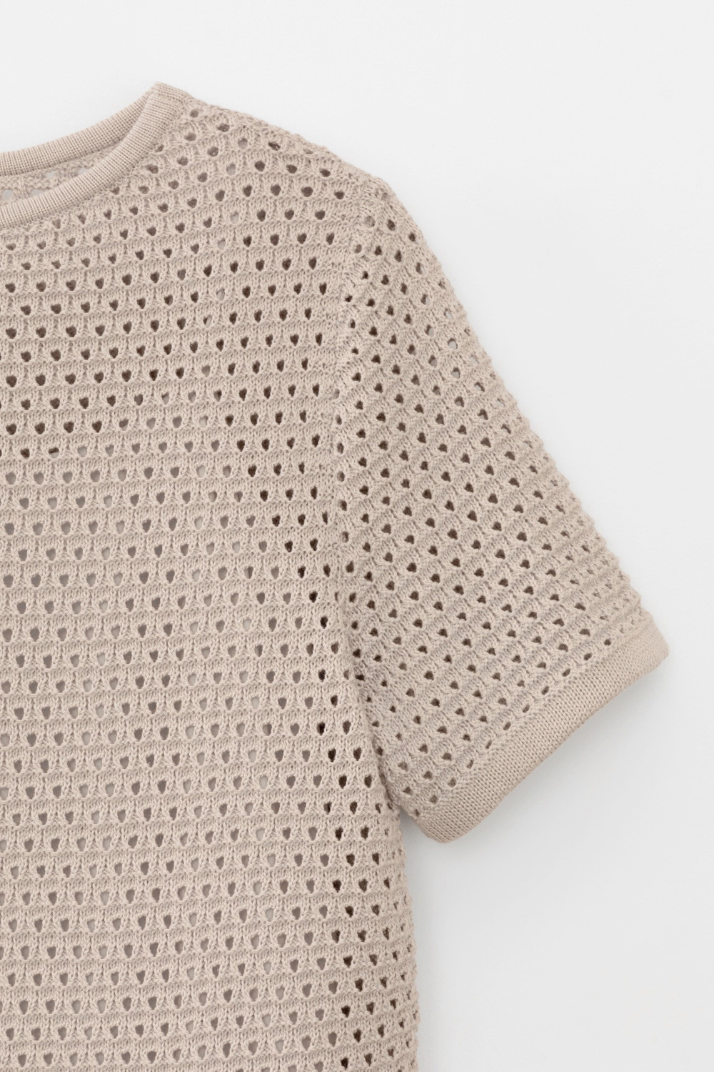 Платье ажурной вязки в универсальном бежевом цвете из итальянского хлопка. Дополняет изделие внутренний невесомый подклад из премиального бифлекса телесного цвета. Хлопок в составе сохраняет форму и дарит ощущение комфорта во время носки.