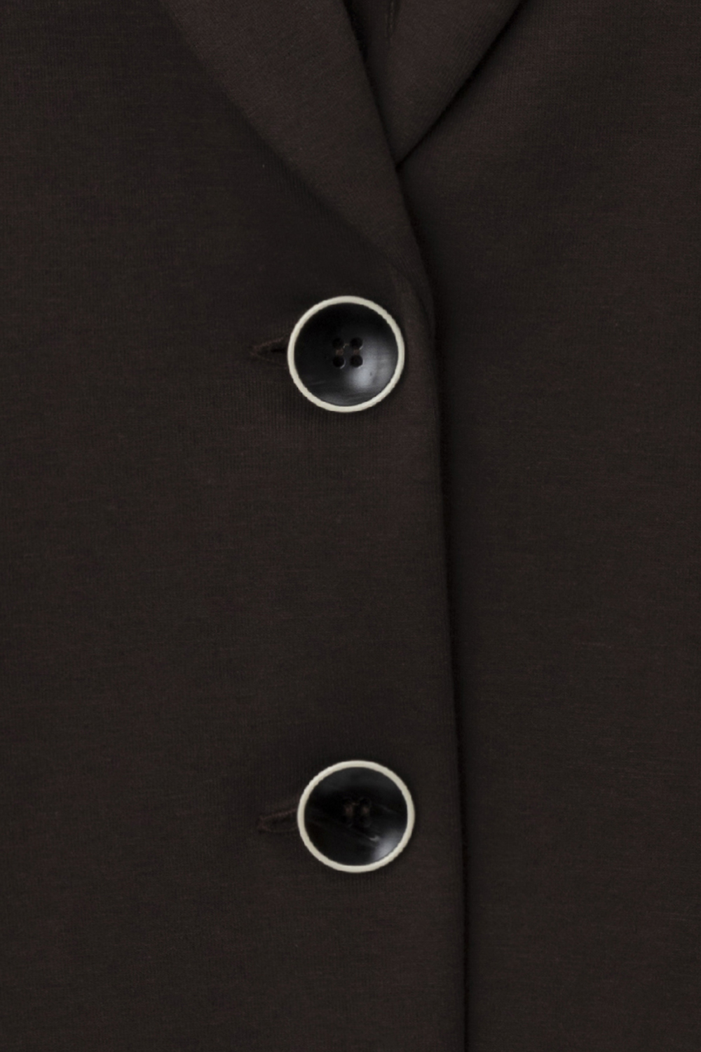 Приталенный пиджак изготовлен из высококачественного трикотажного полотна DOUBLE FACE. Трикотаж прошел специальную каучуковую обработку, что придает ему легкость и шелковистую текстуру. Благодаря уникальному переплетению и специальным методам обработки, он сохраняет свой силуэт и форму, что позволяет легко комбинировать его как с юбками, так и с брюками.