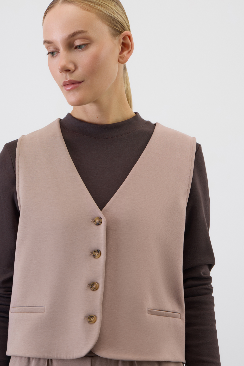 Классический жилет, изготовленный из высококачественного трикотажного полотна DOUBLE FACE. Ткань прошла инновационную силиконовую обработку. Благодаря этой технологии поверхность приобретает невероятно нежную, почти воздушную структуру с легким шелковистым блеском.